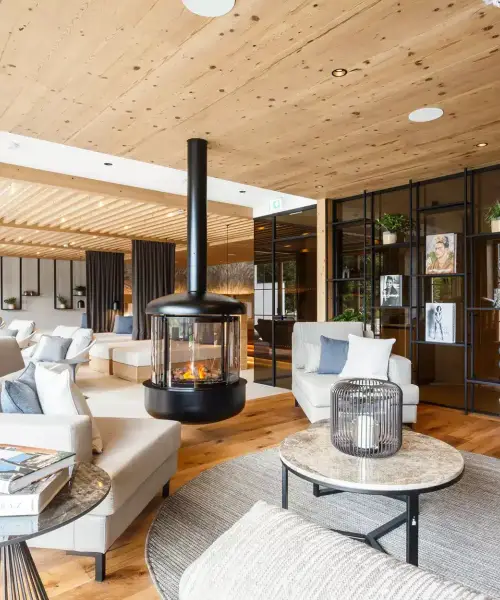 Das beruhigende Knistern der Flammen im Ofen, dick gepolsterte Sofaliegen in lichtdurchfluteten Panoramaräumen und ein Ausblick auf das in grau und grün gesäumte Karwendelgebirge versetzen Körper und Geist in einen harmonischen Zweiklang.
