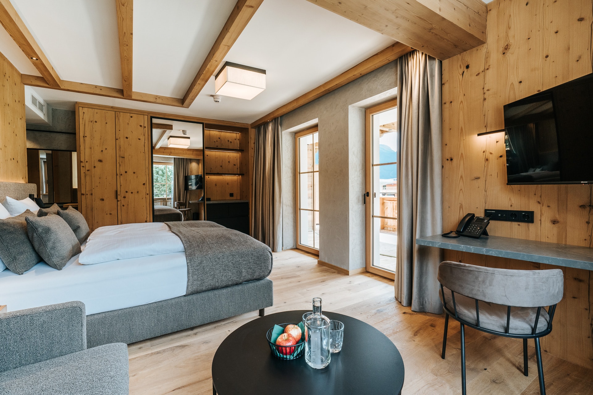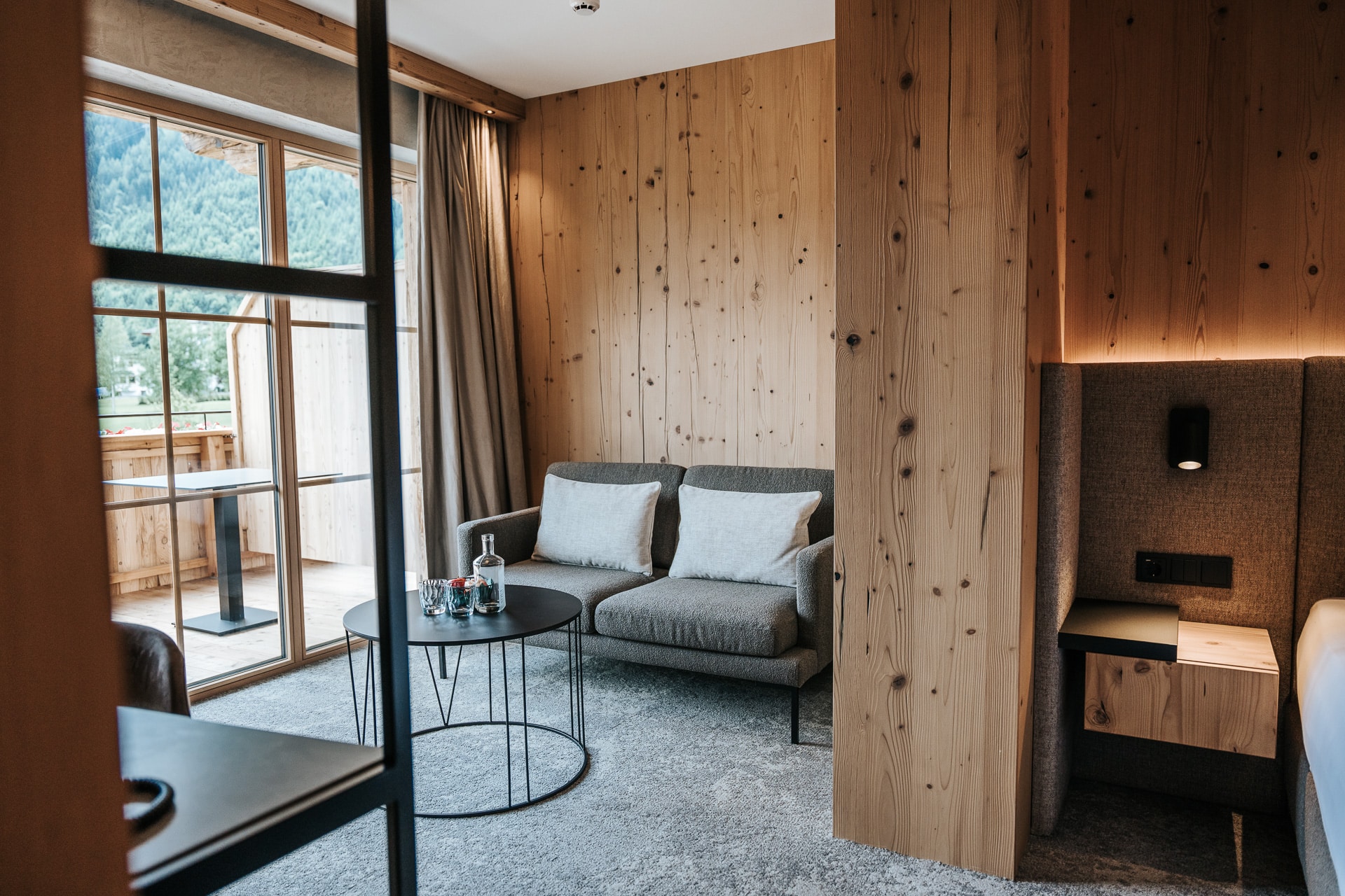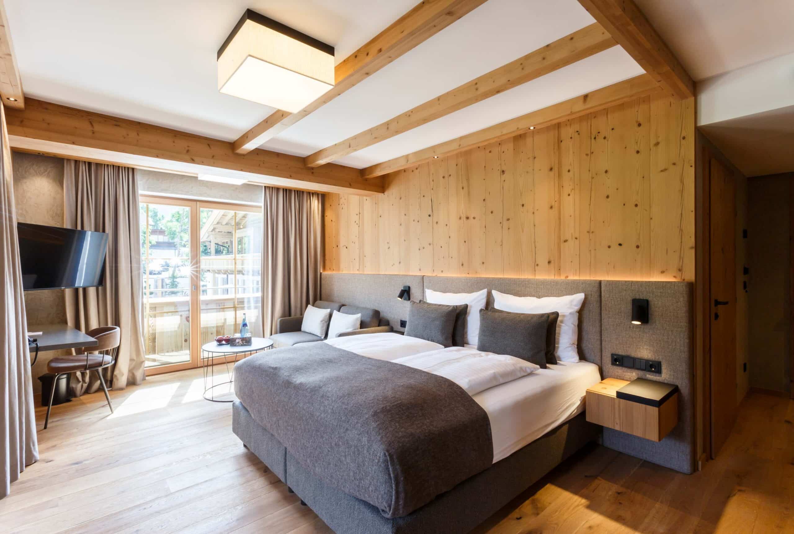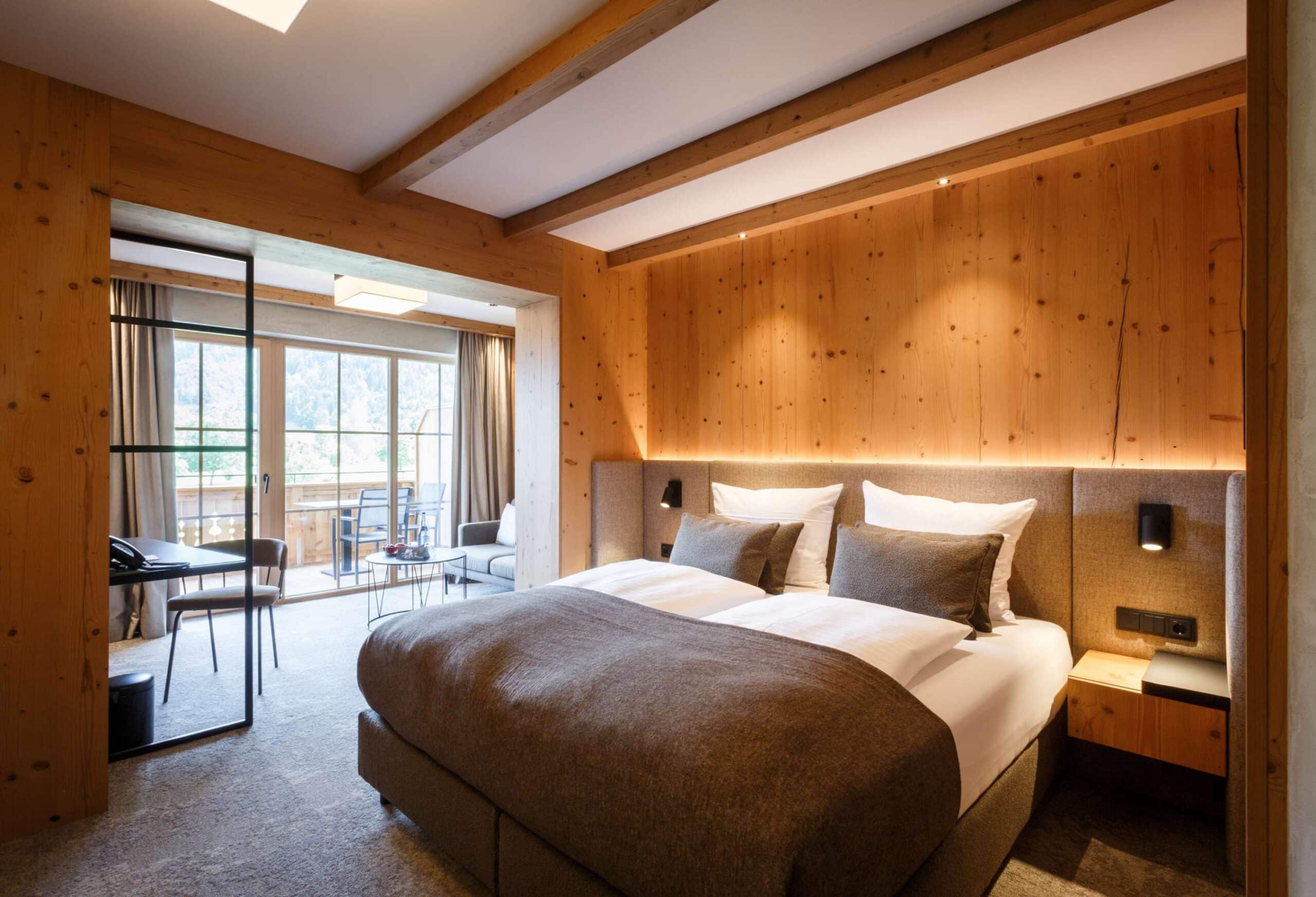 Das beruhigende Knistern der Flammen im Ofen, dick gepolsterte Sofaliegen in lichtdurchfluteten Panoramaräumen und ein Ausblick auf das in grau und grün gesäumte Karwendelgebirge versetzen Körper und Geist in einen harmonischen Zweiklang.
