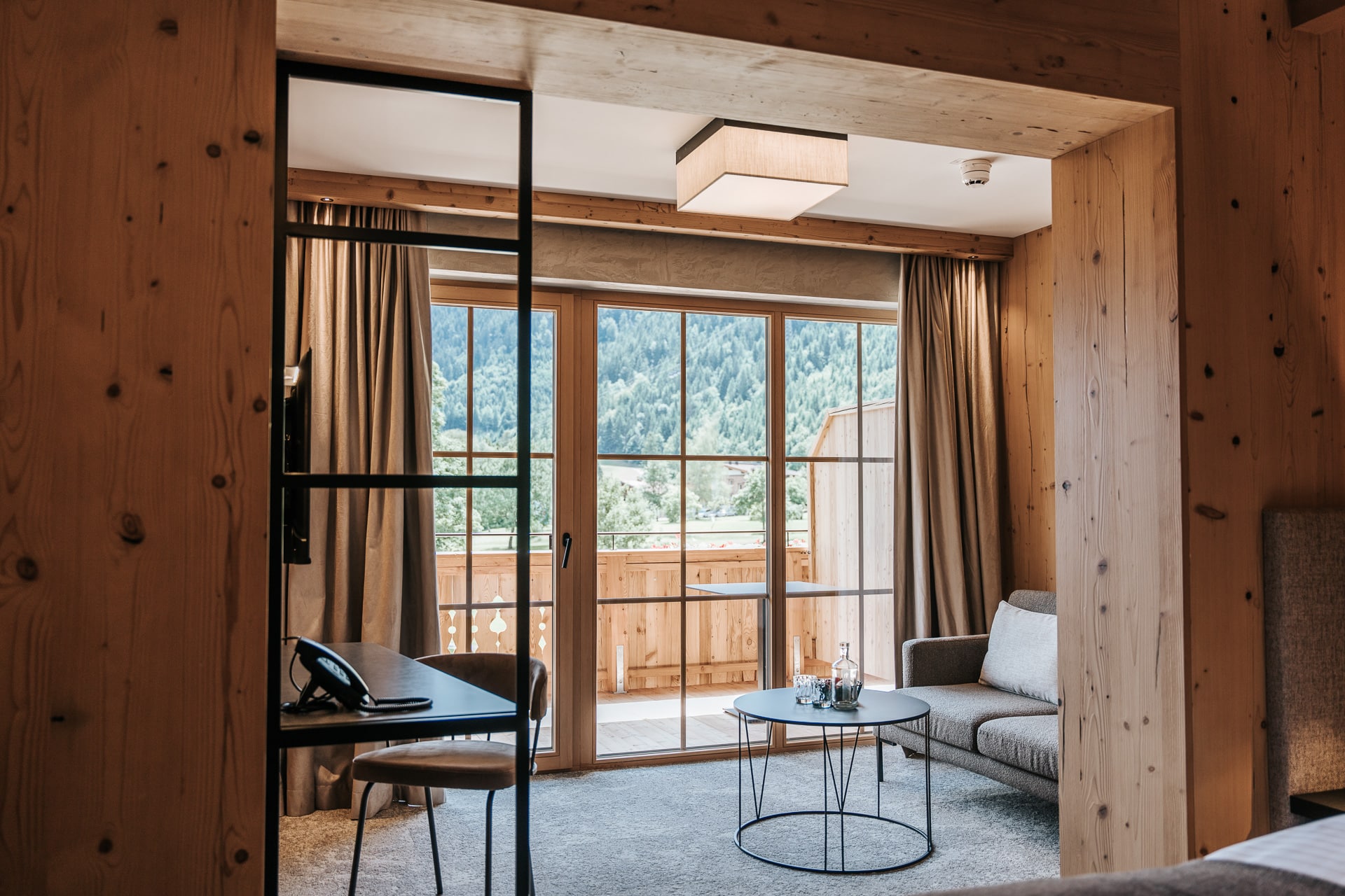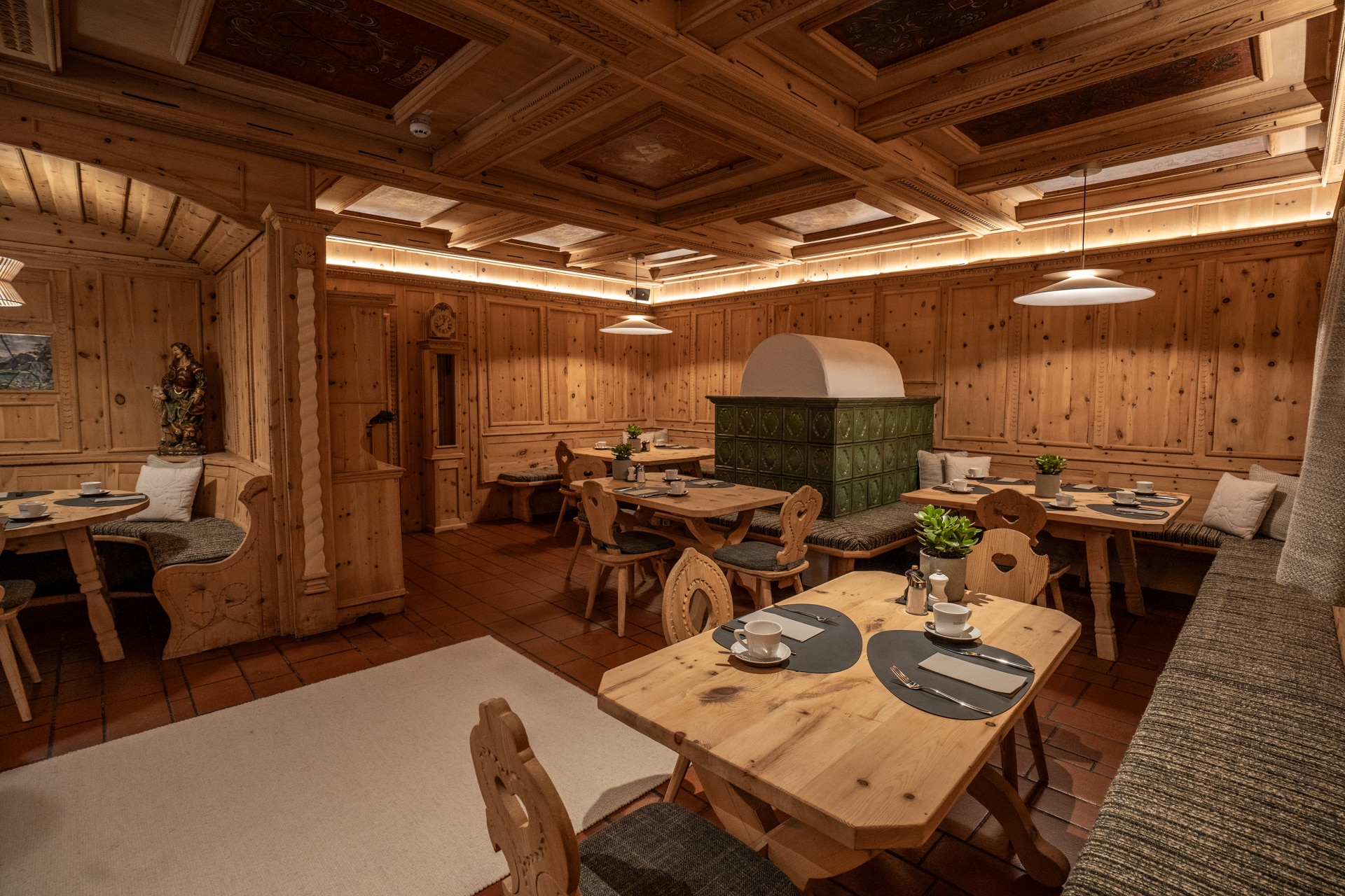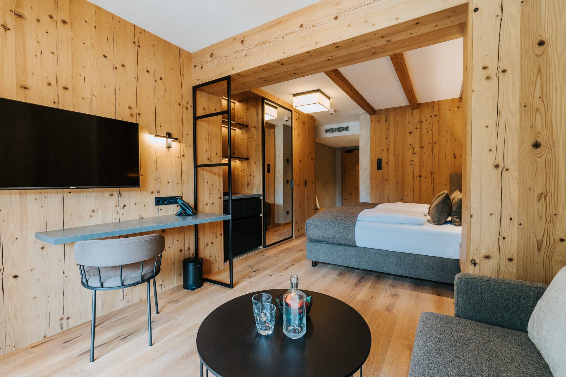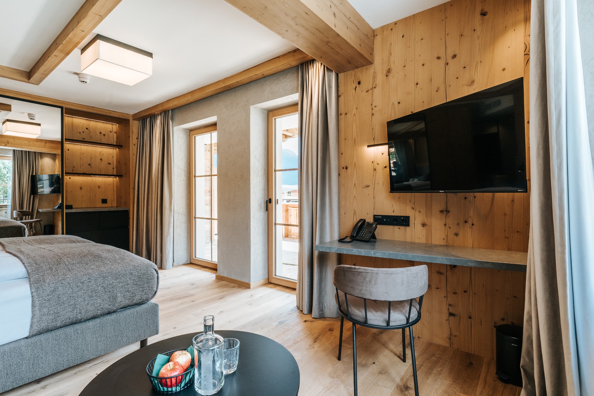 Das beruhigende Knistern der Flammen im Ofen, dick gepolsterte Sofaliegen in lichtdurchfluteten Panoramaräumen und ein Ausblick auf das in grau und grün gesäumte Karwendelgebirge versetzen Körper und Geist in einen harmonischen Zweiklang.