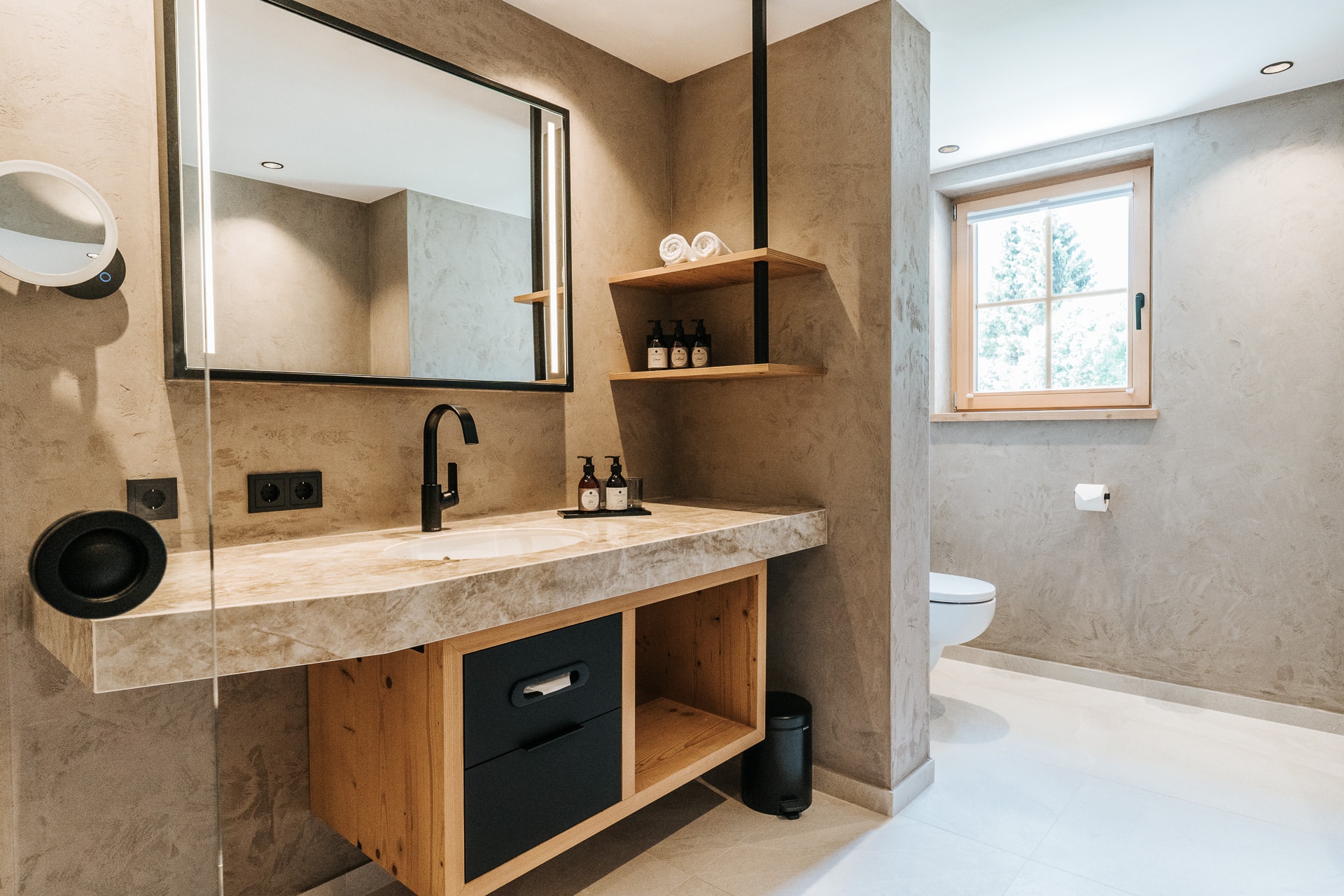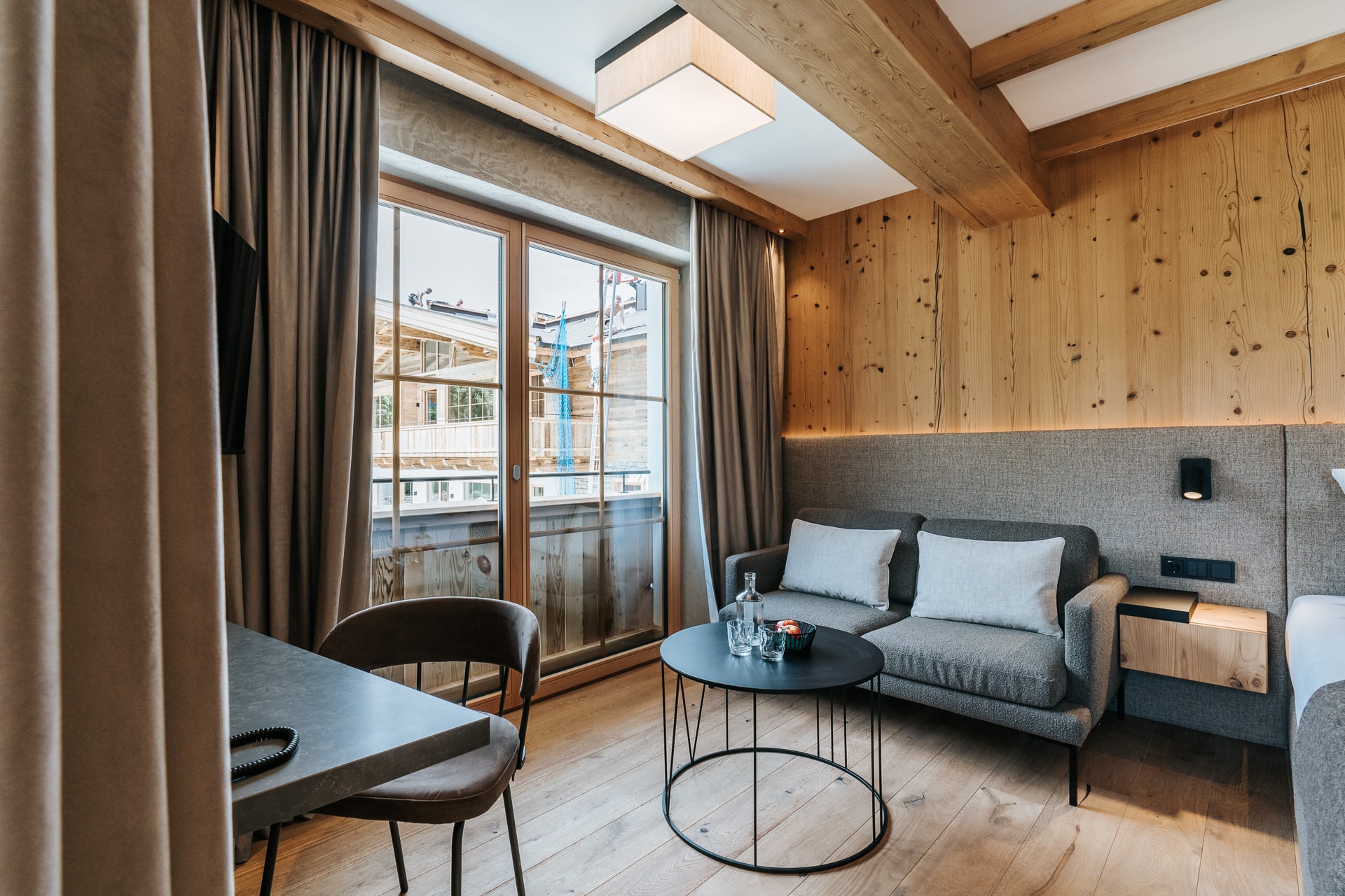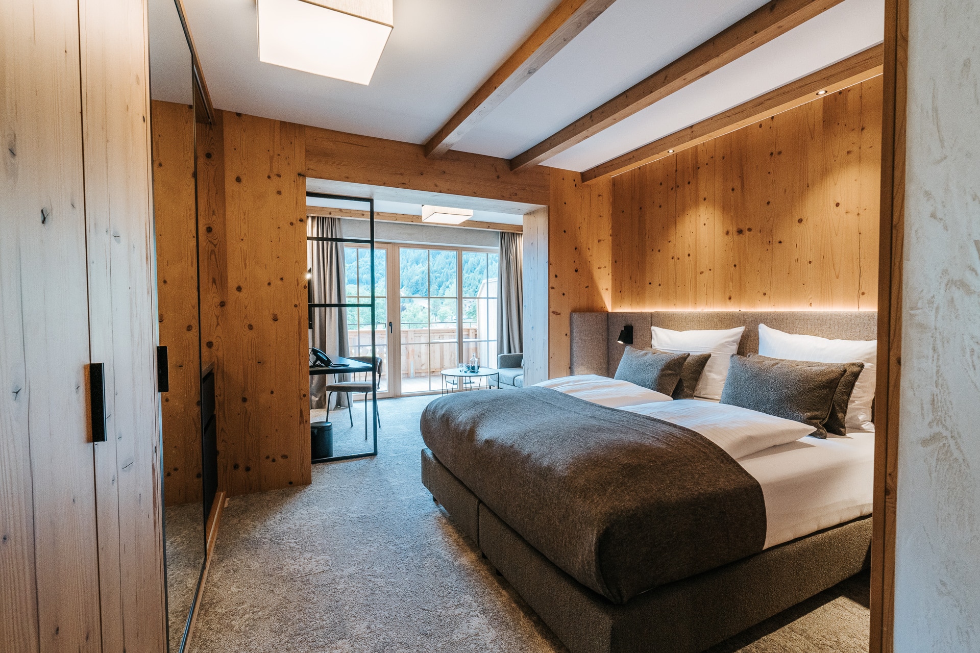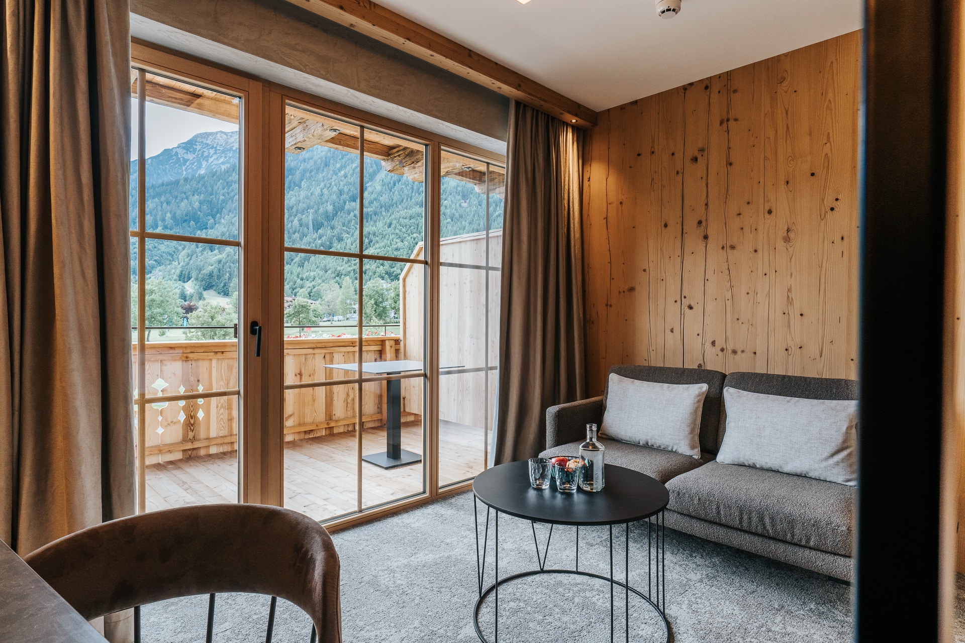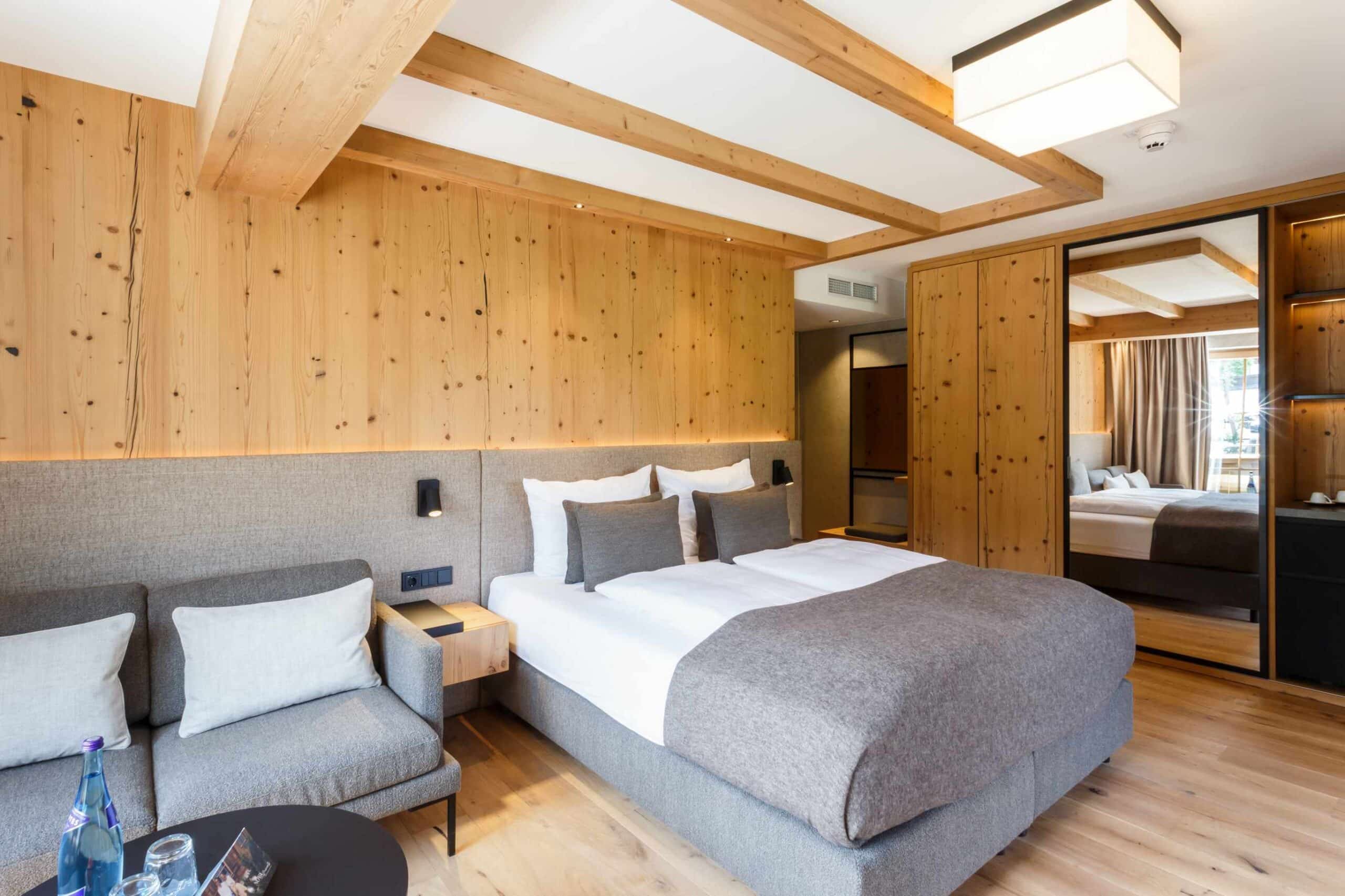 Das beruhigende Knistern der Flammen im Ofen, dick gepolsterte Sofaliegen in lichtdurchfluteten Panoramaräumen und ein Ausblick auf das in grau und grün gesäumte Karwendelgebirge versetzen Körper und Geist in einen harmonischen Zweiklang.