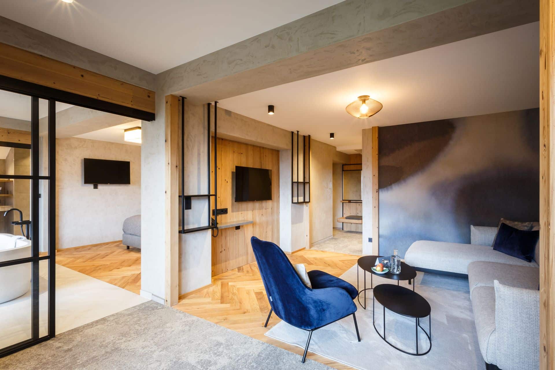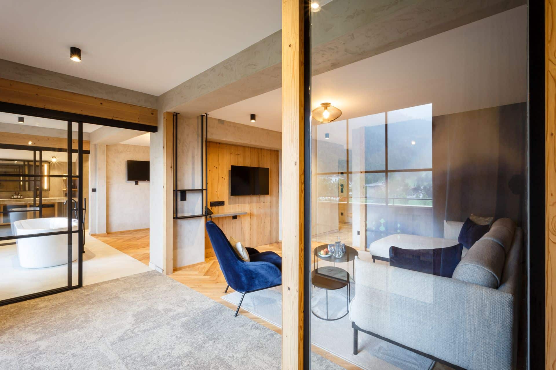 Das beruhigende Knistern der Flammen im Ofen, dick gepolsterte Sofaliegen in lichtdurchfluteten Panoramaräumen und ein Ausblick auf das in grau und grün gesäumte Karwendelgebirge versetzen Körper und Geist in einen harmonischen Zweiklang.